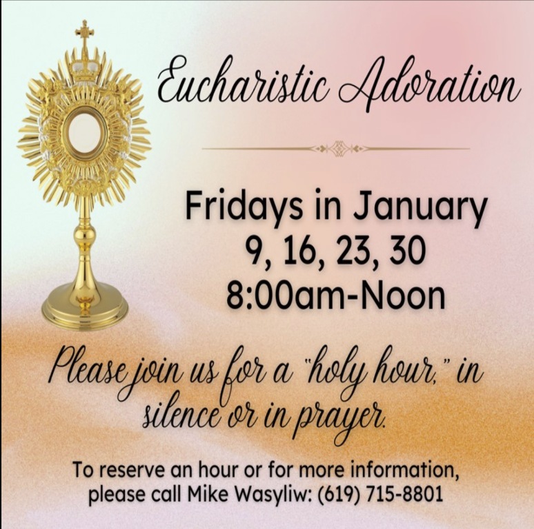 Adoration: First Friday of month, 8:00 AM - 5:00 PM with Closing Vespers at 5PM. Remaining Fridays during the month 8:00 AM - 12:00 PM.